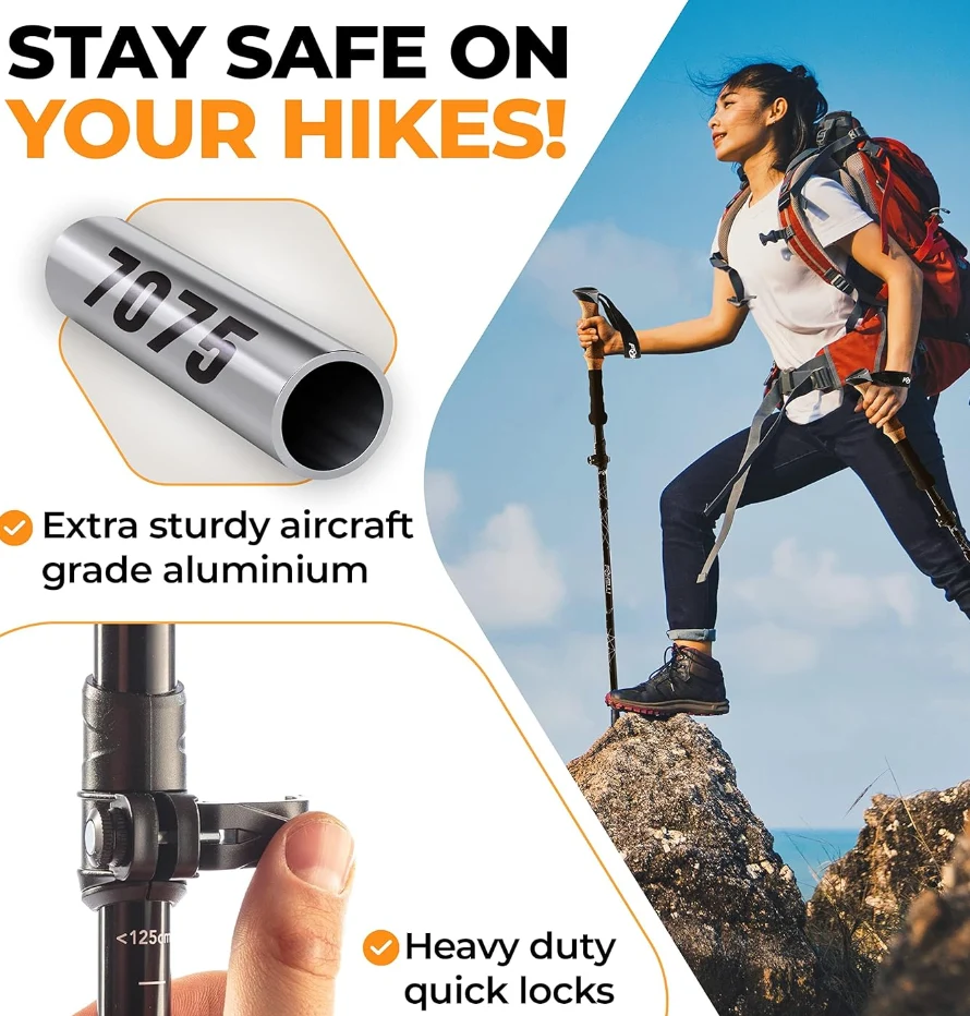ಬಾಗಿಕೊಳ್ಳಬಹುದಾದ ವಾಕಿಂಗ್ ಟ್ರೆಕ್ಕಿಂಗ್ ಪೋಲ್, ಅಸಾಧಾರಣ ಸಮತೋಲನವನ್ನು ಒದಗಿಸುತ್ತದೆ ಮತ್ತು ದೀರ್ಘ ಏರಿಕೆಯ ಸಮಯದಲ್ಲಿ ಜಂಟಿ ಪರಿಣಾಮವನ್ನು ಕಡಿಮೆ ಮಾಡುತ್ತದೆ. ಆರಂಭಿಕರಿಗಾಗಿ ಮತ್ತು ಅನುಭವಿ ಪಾದಯಾತ್ರಿಗಳಿಗೆ ಸೂಕ್ತವಾಗಿದೆ.