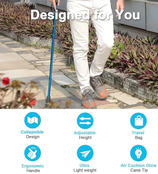 ಫೋಲ್ಡಬಲ್ ಟೆಲಿಸ್ಕೋಪಿಕ್ ವಾಕಿಂಗ್ ಕಬ್ಬು, ರಾತ್ರಿಯಲ್ಲಿಯೇ ತುದಿ ಬೆಳಗುತ್ತದೆ, ಇದು ರಾತ್ರಿಯ ವಾಕಿಂಗ್ನ ಸುರಕ್ಷತೆಯನ್ನು ಬಹಳವಾಗಿ ಖಾತ್ರಿಗೊಳಿಸುತ್ತದೆ. (ನಿರ್ದಿಷ್ಟ ಸಮಯಕ್ಕೆ ಮಾತ್ರ ಬೆಳಕಿನಲ್ಲಿ ಒಡ್ಡಿಕೊಳ್ಳುವುದರೊಂದಿಗೆ, ಗ್ಲೋ ಕೋನ್ ಕತ್ತಲೆಯಲ್ಲಿ ಗೋಚರತೆಗೆ ಬರುತ್ತದೆ.