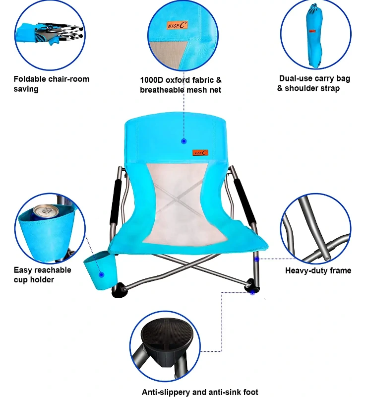 ಫೋಲ್ಡಿಂಗ್ ಬೀಚ್ ಸೆಟ್, ವಯಸ್ಕರಿಗೆ ಕಡಿಮೆ ಬೀಚ್ ಕುರ್ಚಿಗಳು ಕಪ್ ಹೋಲ್ಡರ್ನೊಂದಿಗೆ ಪೋರ್ಟಬಲ್ ಮರಳು ಕುರ್ಚಿಯನ್ನು ಮಡಚಿಕೊಳ್ಳುತ್ತವೆ ಮತ್ತು ಕ್ಯಾರಿ ಬ್ಯಾಗ್.ಜೆಜಿಯಾಂಗ್ ಜಿಯಾವು ಹೊರಾಂಗಣ ಉತ್ಪನ್ನಗಳು ಕಂ, ಲಿಮಿಟೆಡ್, ನೀವು ಕುಳಿತುಕೊಳ್ಳುವಾಗ ಗಾಳಿಯನ್ನು ಹರಿಯಲು ಅನುವು ಮಾಡಿಕೊಡುವ ಉಸಿರಾಡುವ ಮತ್ತು ತಂಪಾಗಿಸುವ ಜಾಲರಿ ಬಟ್ಟೆಯನ್ನು. ಲೋಹದ ತೋಳುಗಳ ಮೇಲೆ ತೋಳಿನ ಇಟ್ಟ ಮೆತ್ತೆಗಳಿವೆ ಆದ್ದರಿಂದ ನಿಮ್ಮ ತೋಳುಗಳನ್ನು ಆರಾಮವಾಗಿ ವಿಶ್ರಾಂತಿ ಮಾಡಬಹುದು.