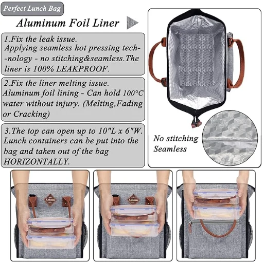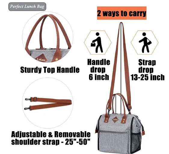 ದೊಡ್ಡ lunch ಟದ ಚೀಲವು ಮುಖ್ಯ ವಿಭಾಗವನ್ನು ಹೊಂದಿದೆ (10.5 "x6" x12 "), ದೊಡ್ಡ ಮುಂಭಾಗದ ipp ಿಪ್ಪರ್ ಪಾಕೆಟ್ (8" x7 "x1.5"), ಹಿಂದಿನ ಪಾಕೆಟ್ (9.5 "x6.5") ಮತ್ತು 2 ಸೈಡ್ ಜಾಲರಿ ಪಾಕೆಟ್ಗಳನ್ನು ಹೊಂದಿದೆ. ಟಾಪ್ ಹ್ಯಾಂಡಲ್ಗಳು ಮತ್ತು ಹೊಂದಾಣಿಕೆ ಮತ್ತು ತೆಗೆಯಬಹುದಾದ ಭುಜದ ಪಟ್ಟಿಯ (25 "-50") ಸುಲಭ ಕ್ಯಾರಿಗಾಗಿ ವಿನ್ಯಾಸ.