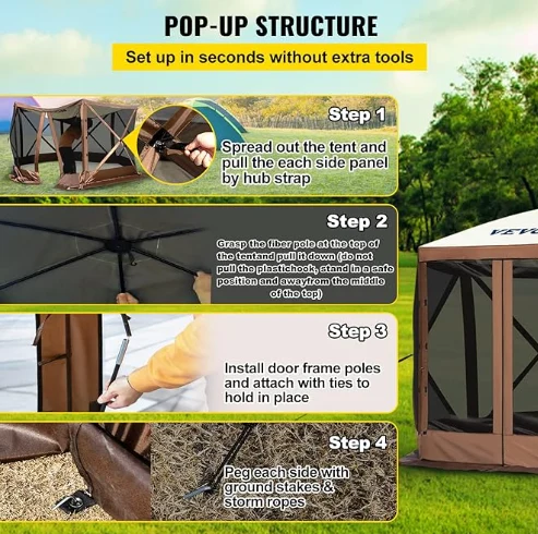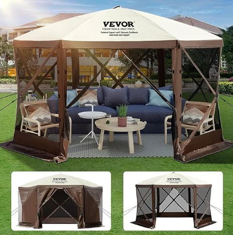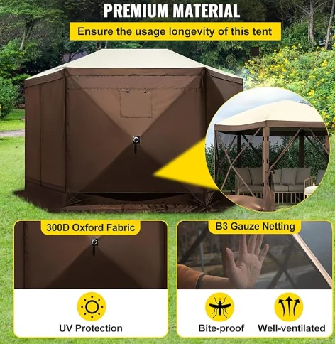 ರೇನ್ ಪ್ರೂಫ್ ಪೆರ್ಗೊಲಾ ಕ್ಯಾಂಪಿಂಗ್ ಮೇಲಾವರಣ ಟೆಂಟ್, ಕ್ಯಾಂಪಿಂಗ್ ಗೆ az ೆಬೊ ಟೆಂಟ್ ಅನ್ನು 300 ಡಿ ಆಕ್ಸ್ಫರ್ಡ್ ಫ್ಯಾಬ್ರಿಕ್ ಮತ್ತು ಬಿ 3 ಗಾಜ್ ನೆಟಿಂಗ್ನಿಂದ ತಯಾರಿಸಲಾಗುತ್ತದೆ. ಇದು ಐಪಿಎಕ್ಸ್ 3 ಜಲನಿರೋಧಕ, ಬೈಟ್-ಪ್ರೂಫ್ ಮತ್ತು ಯುವಿ-ಪ್ರೂಫ್. 12 'x 12' ಗೆ az ೆಬೊ ಮೇಲಾವರಣವು ಹೊರಾಂಗಣ ಆಶ್ರಯ ಬಳಕೆಗೆ ದೊಡ್ಡ ಸ್ಥಳವನ್ನು ಒದಗಿಸುತ್ತದೆ.